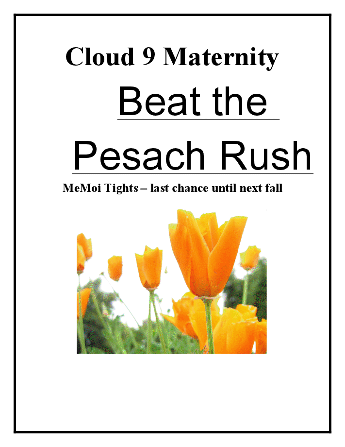 Cloud 9 Maternity Beat the Pesach Rush February 22, 2013 Leave a Comment Join us for a preview of our newest maternity clothing. Please call us for an appointment today! Sandy Zeitler (216) 297-9543