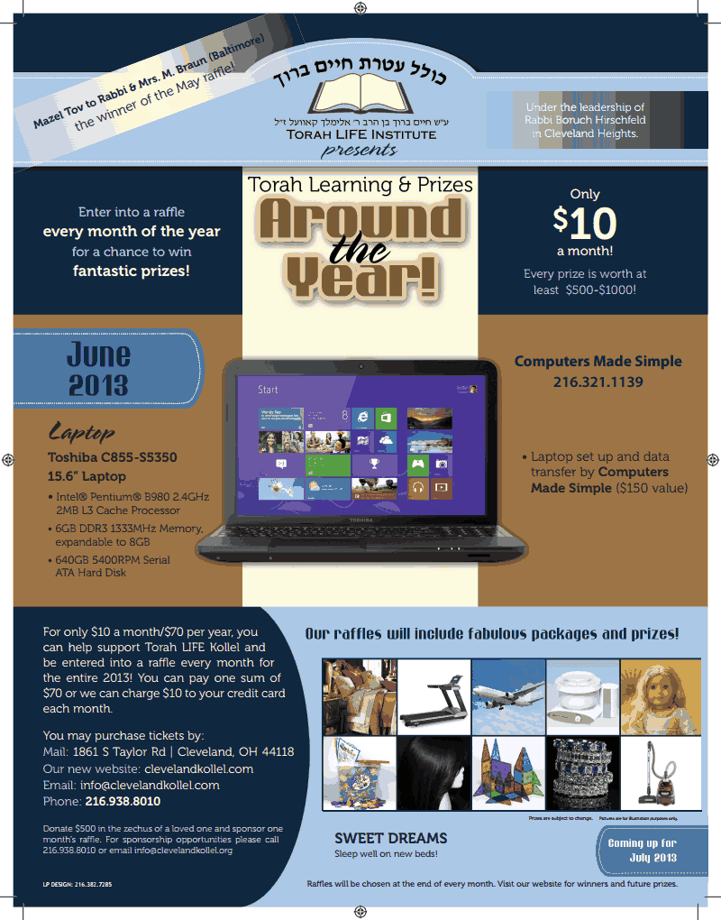 Every month in 2013, Torah LIFE Kollel, under the leadership of Rabbi Boruch Hirschfeld, will be raffling off fantastic prizes! Every prize is worth 500- 1000 dollars! For ONLY $10 a month or $70 you can be entered into the raffle every month for the rest of the year, and you will have the zechus of supporting Torah. This month’s raffle is a Toshiba Lap Top including service from Computers Made Simple ($150 value for service alone) !