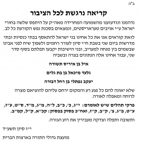 Heartfelt Call to the Community for Prayer for the 3 Abducted Boys June 16, 2014 Leave a Comment A call for prayer to Yidden everywhere to gather together for prayer on the behalf of the 3 abducted boys signed by the Moetzes Gedolai HaTorah in the USA.
