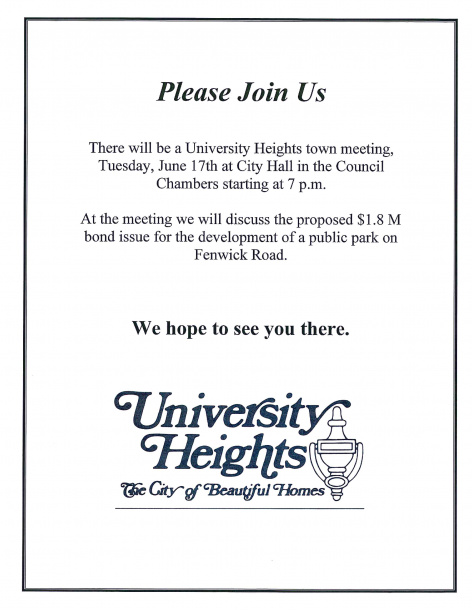 University Heights Town Meeting to Discuss Proposed $1.8M for Fenwick Rd Park June 16, 2014 Leave a Comment