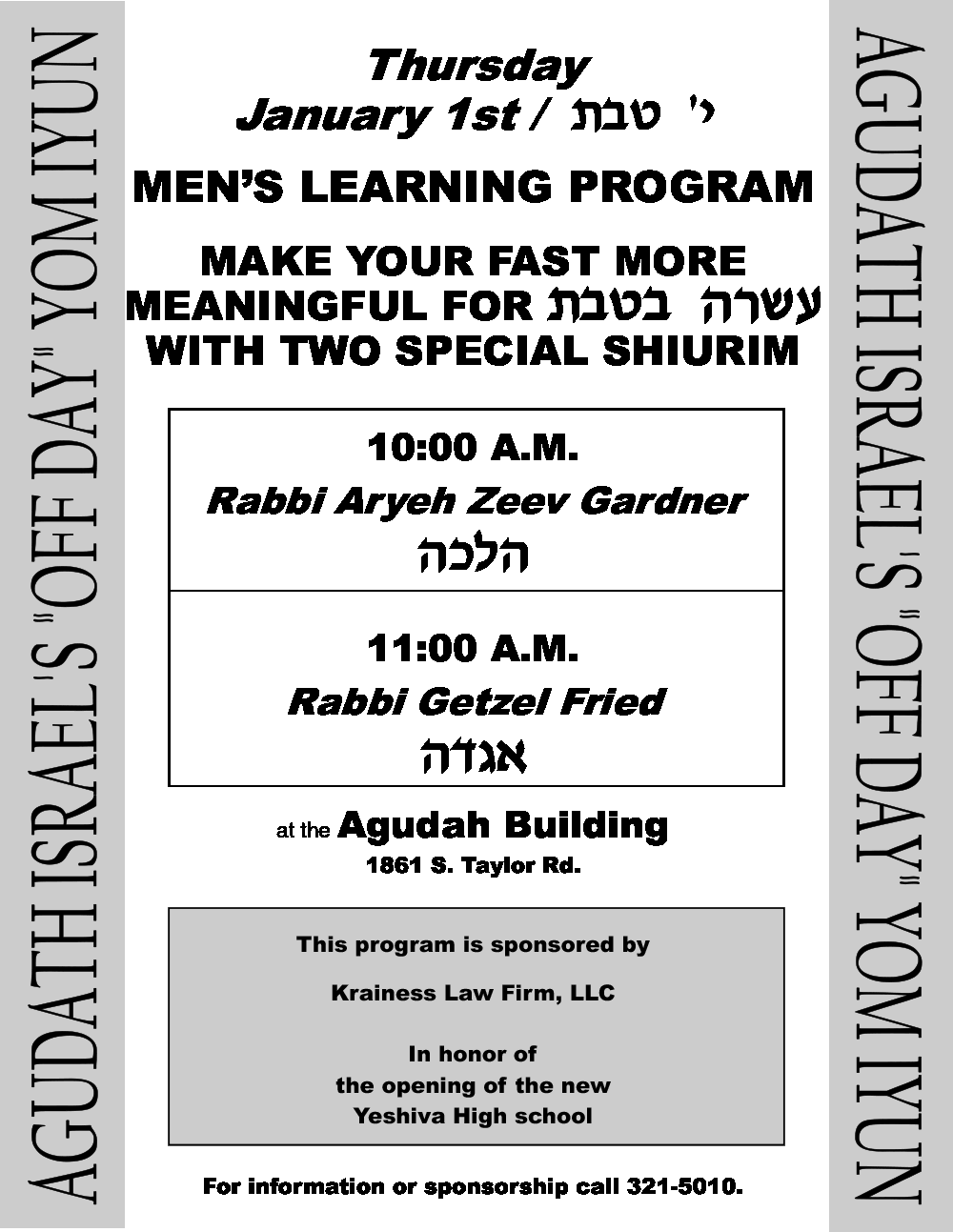 Agudath Israel Off Day Yom Iyun – January 1st, 2015 – Asarah B’Teves December 30, 2014 Leave a Comment