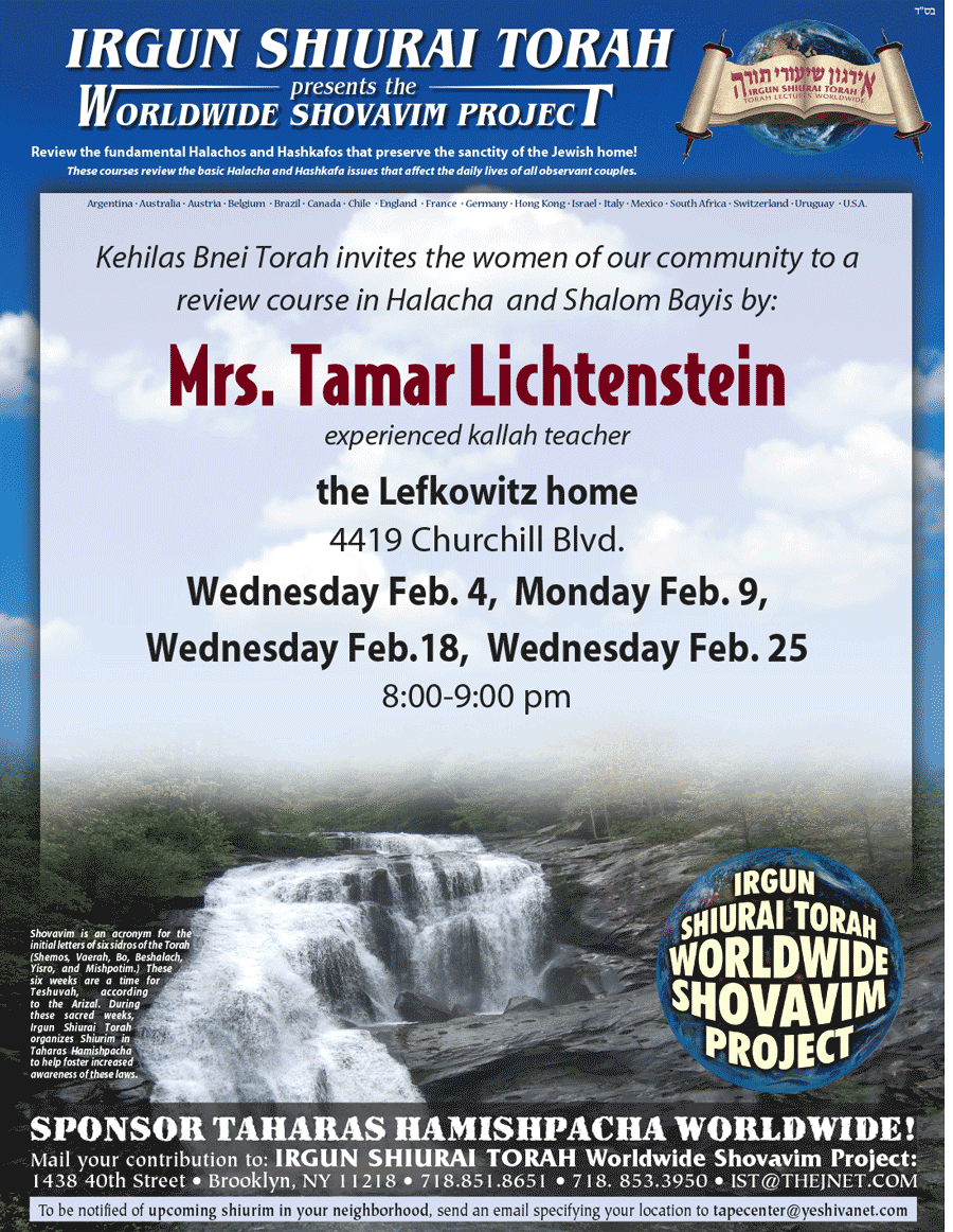 Review Course in Halacha and Shalom Bayis by Mrs. Tamar Lichtenstein