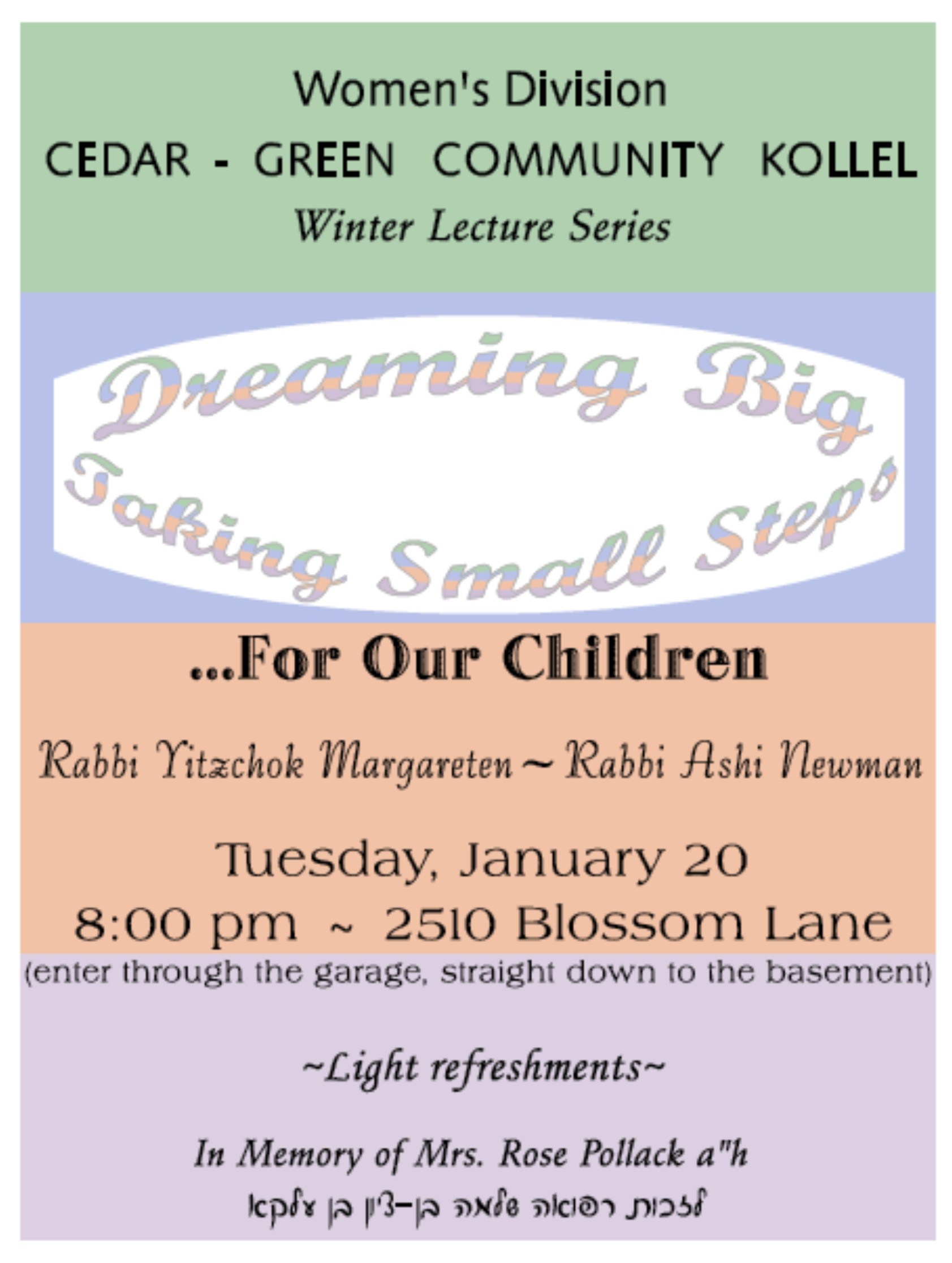 Women’s Division Cedar-Green Kollel – Winter Lecture Series – 2nd of 3 in Series