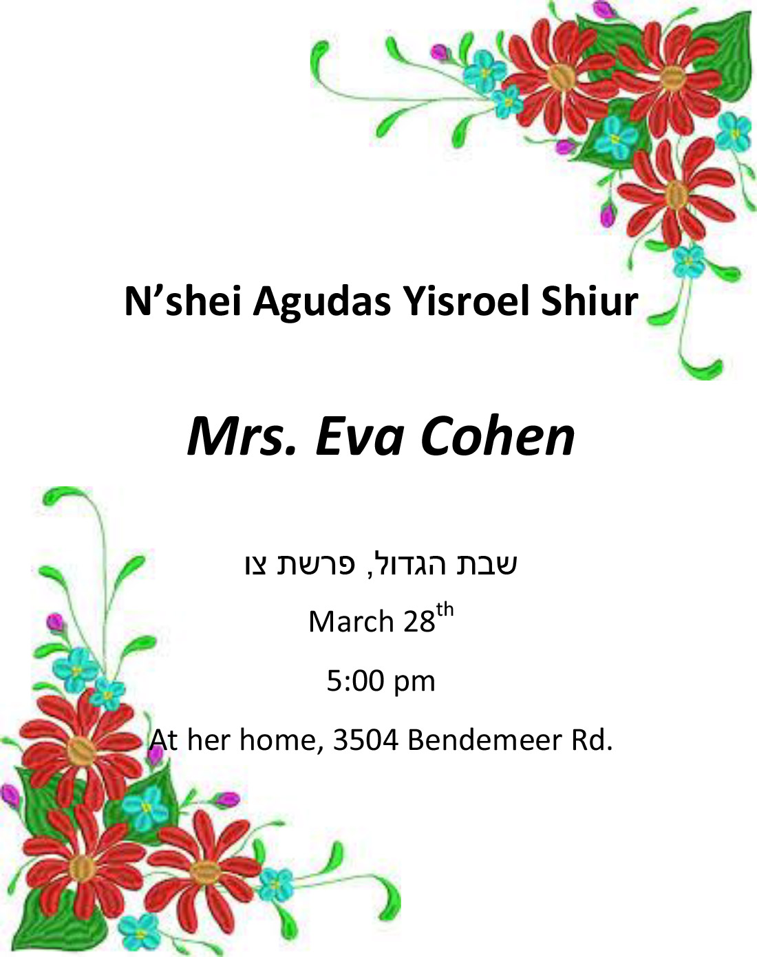 This Shabbos March 28– Rabbi Yehuda Cahan will be giving a Shabbos Hagadol drasha for the Women of the community at Kehilas Bnei Torah (Yavne building downstairs) at 4:45pm. There will be a drasha for men at 6:20 followed by Mincha at 7:20. There will also be an earlier Mincha at 6pm.