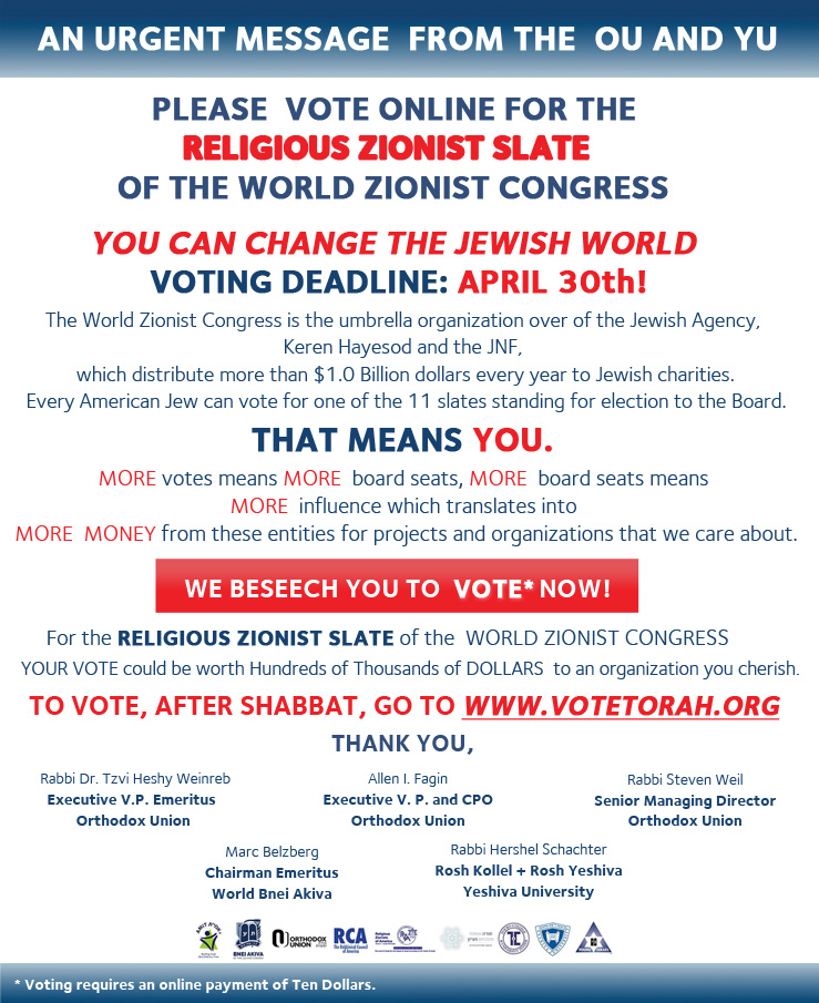 Voting for representatives to the next WZO Congress is now in progress; voting ends on April 30. The greater the Orthodox representation in the Congress, the greater our influence will be upon Knesset decisions affecting millions of Jews in Israel and beyond.