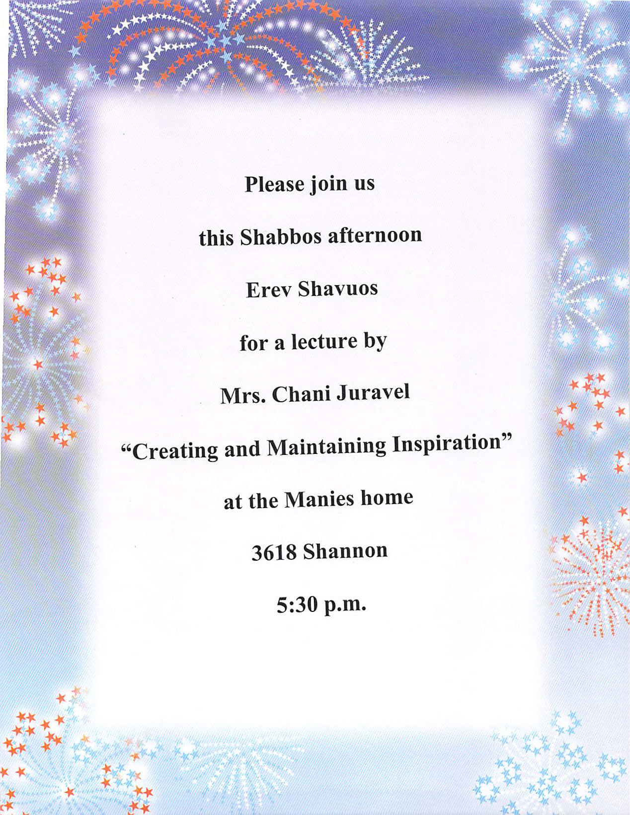 Mrs. Chani Juravel – “Creating and Maintaining Inspiration” – Manies Home May 22, 2015 Leave a Comment