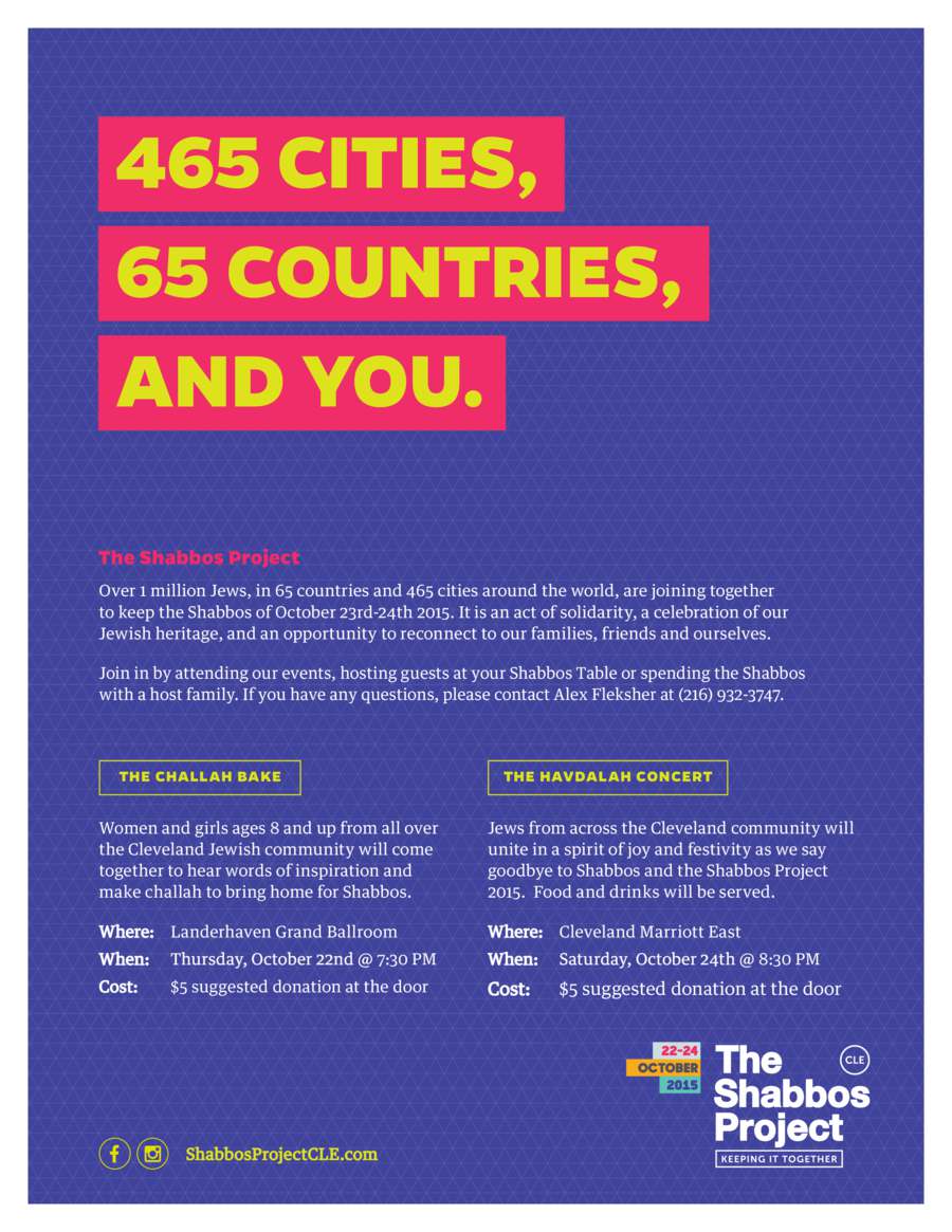Over Over 1 million Jews, in 65 countries and 465 cities around the world, are joining together to keep the Shabbos of October 23rd-24th 2015. It is an act of solidarity, a celebration of our Jewish heritage, and an opportunity to reconnect to our families, friends and ourselves. Please visit our website shabbosprojectcle.com to learn more.