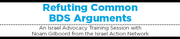 Please join us for “Refuting Common BDS Arguments,” featuring Noam Gilboord, Director of Community Strategy for the Israel Action Network.