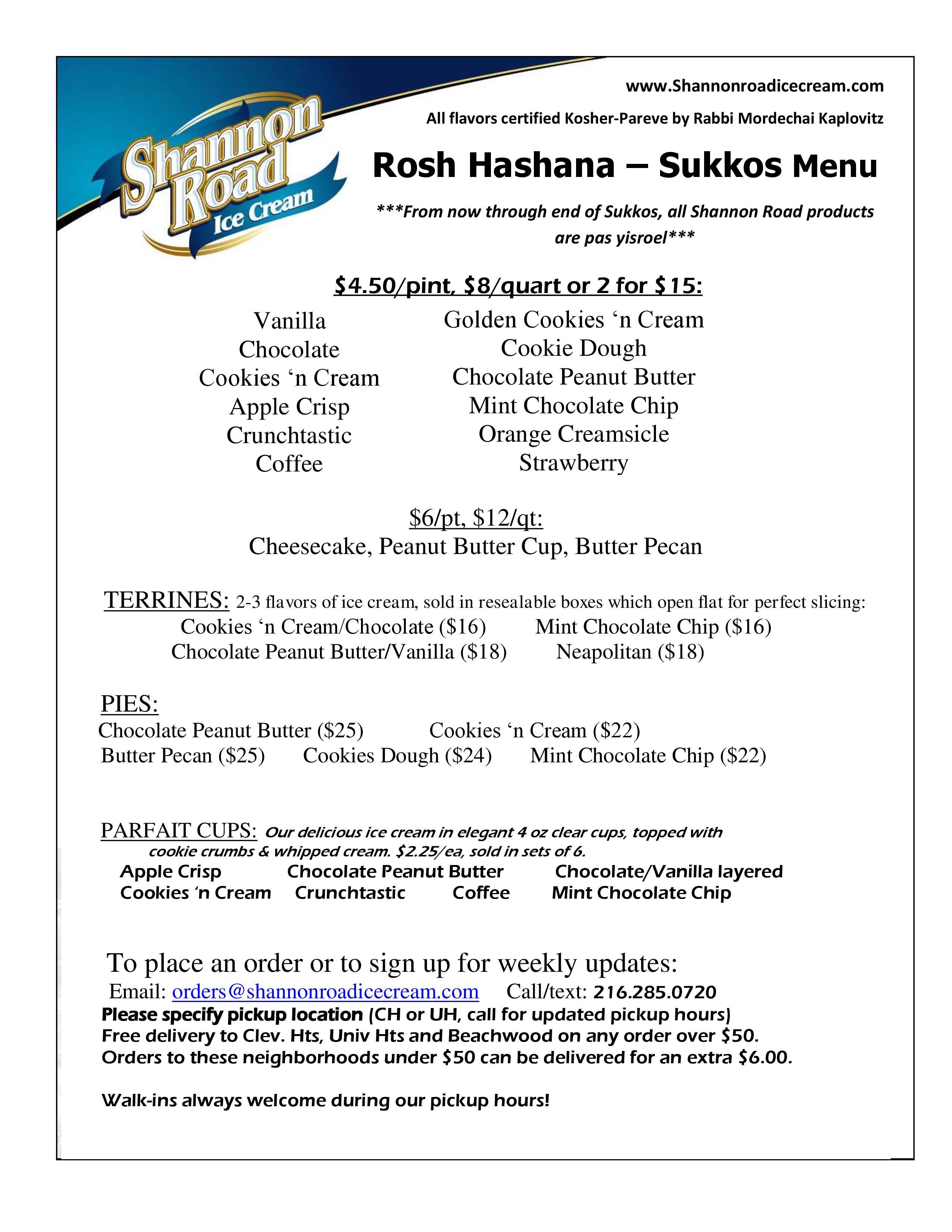 Shannon Road Ice Cream – Rosh Hashana – Sukkos Menu