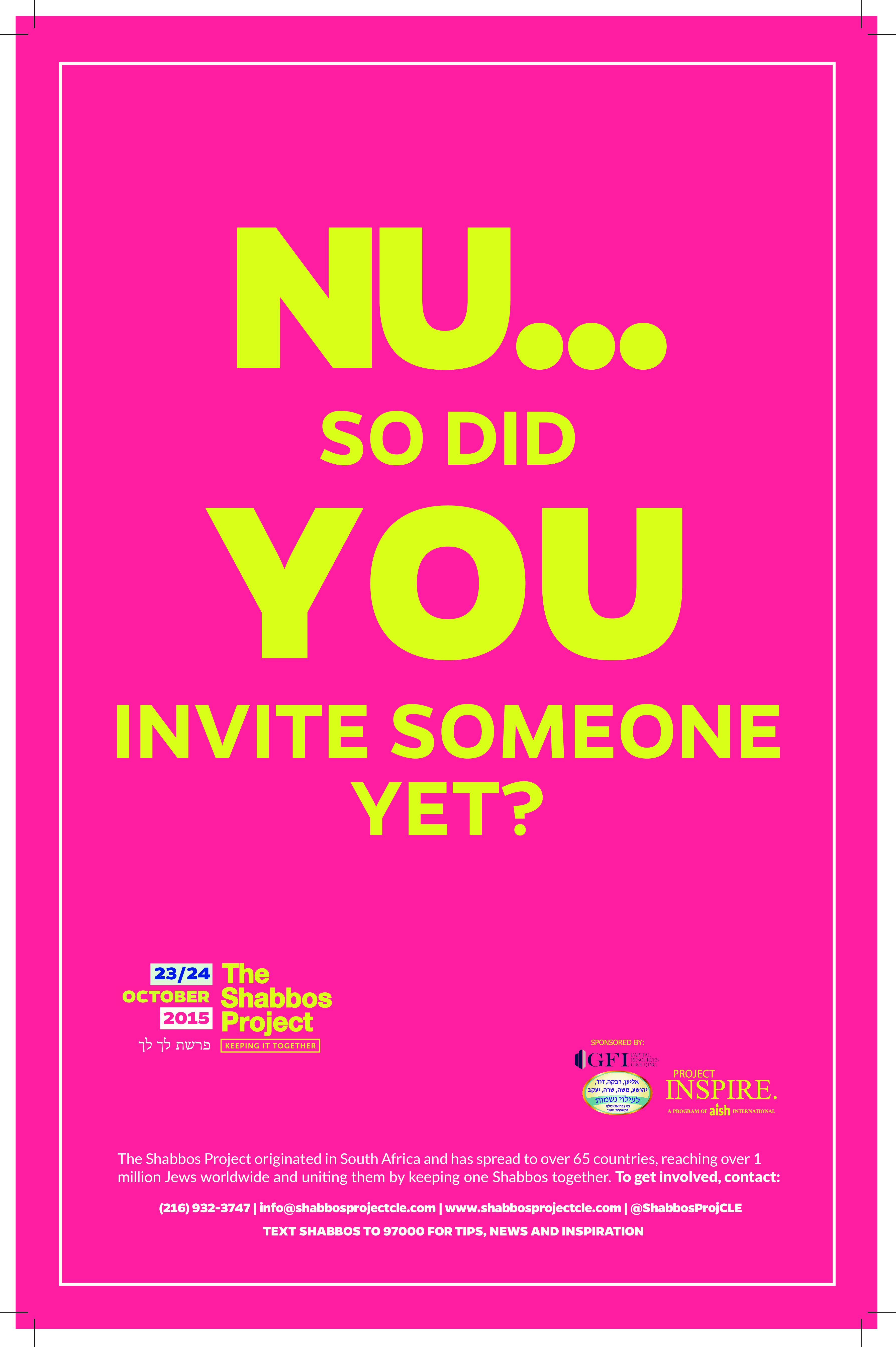 Over 1 million Jews, in 65 countries and 465 cities around the world, are joining together to keep the Shabbos of October 23rd-24th 2015. It is an act of solidarity, a celebration of our Jewish heritage, and an opportunity to reconnect to our families, friends and ourselves. Please visit our website shabbosprojectcle.com to learn more.