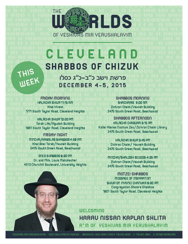 Yeshivas Mir Cleveland Shabbos of Chizuk Featuring Rav Nissan Kaplan, shlita December 3, 2015 Leave a Comment