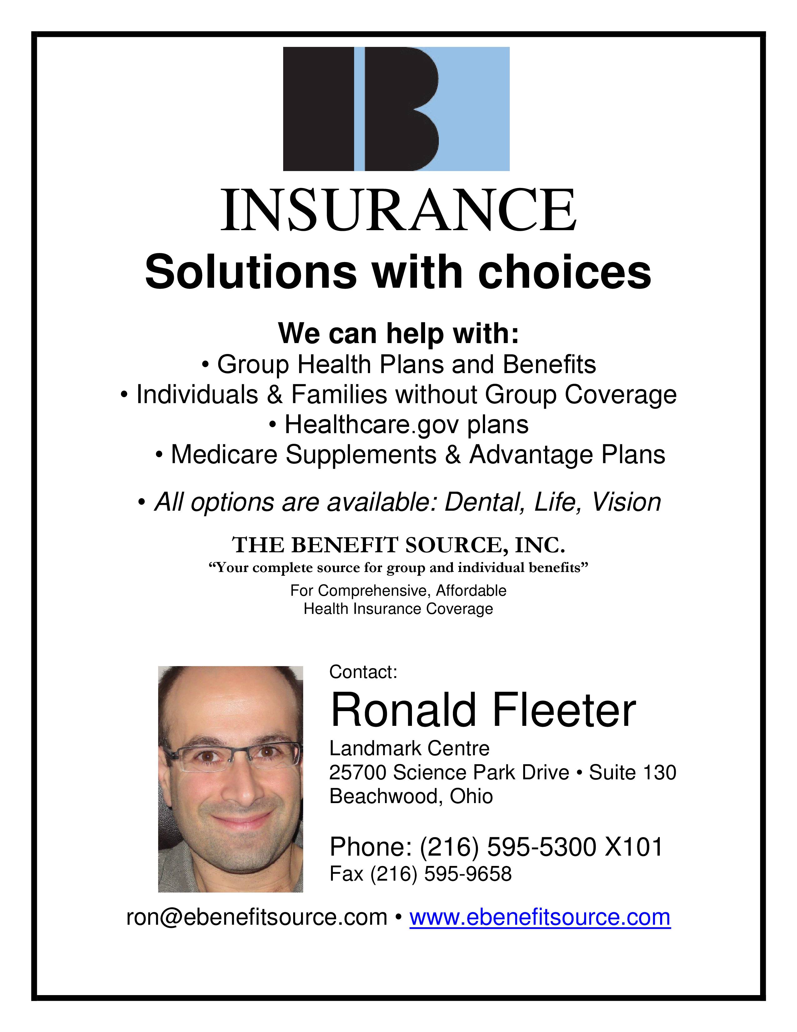 Ron Fleeter – Insurance Solutions With Choices December 8, 2015 Leave a Comment Need help with group or individual health insurance during open enrollment call Ron Fleeter at 216-595-5300 X 101 or visit www.ebenefitsource.com