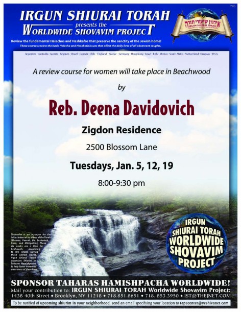 Shovavim Review Course for Women by Reb. Deena Davidovich at Zigdon Residence January 17, 2016 Leave a Comment A review class for married women in all stages of life.