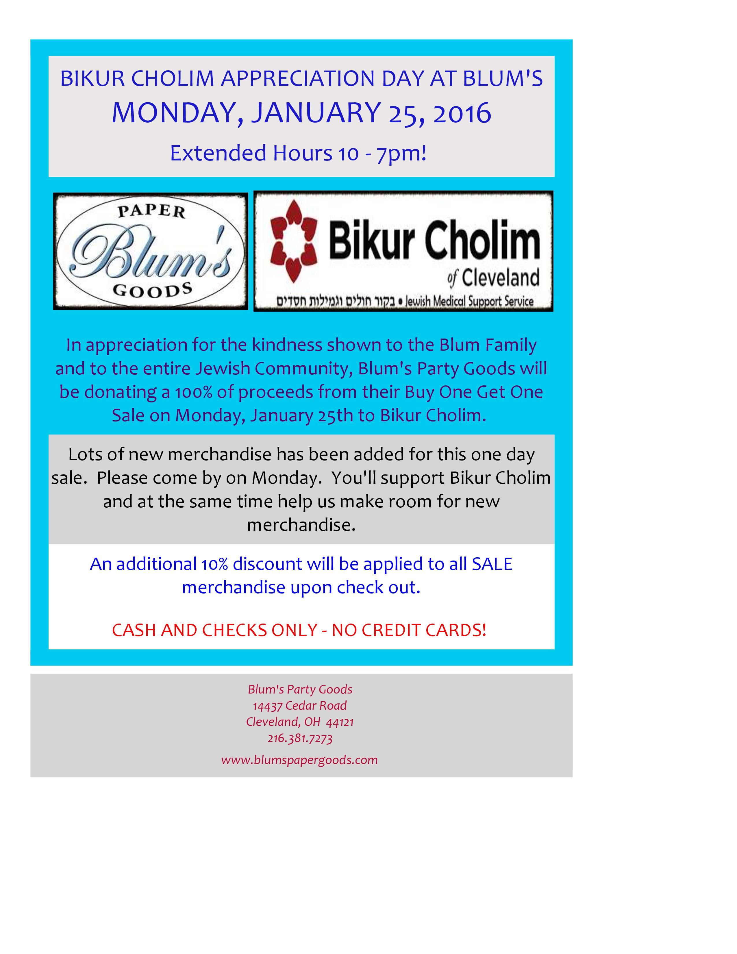 Please call 216-245-6450 with questions (we are happy to discuss donation process or anything else) or email Joys4@aol.com with any questions or to BE”H to donate.