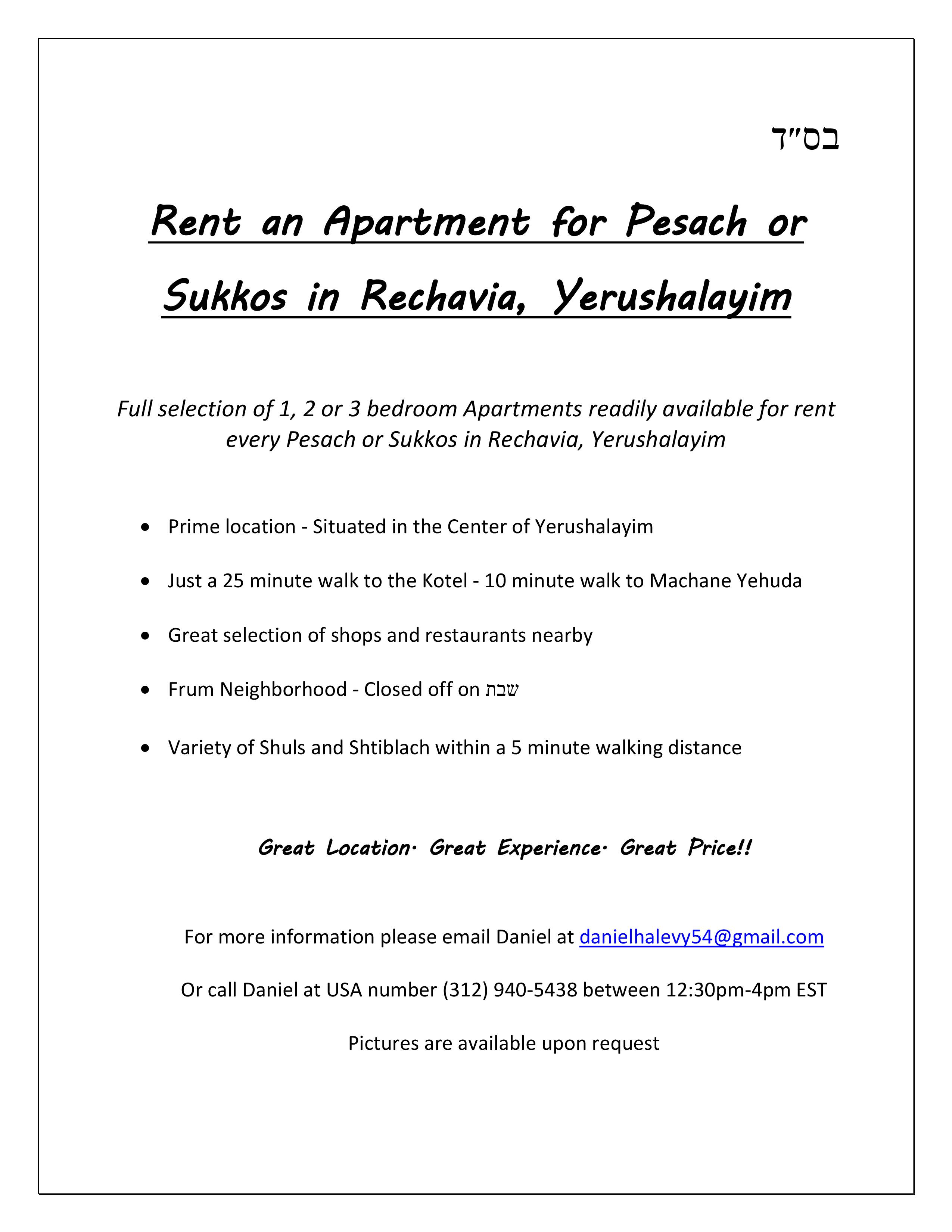 Rent an Apartment for Pesach or Sukkos in Rechavia, Yerushalayim