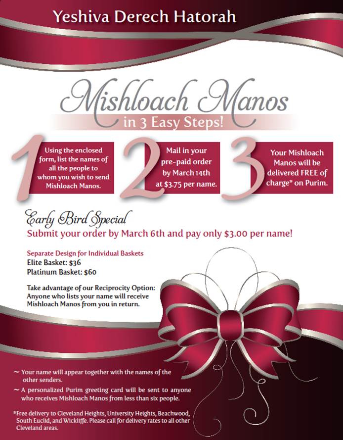 Yeshiva Derech HaTorah Mishloach Manos in 3 Easy Steps! March 10, 2016 Leave a Comment Download an order form here >>