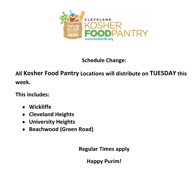 Cleveland Kosher Food Pantry Schedule Change for the Week of Purim