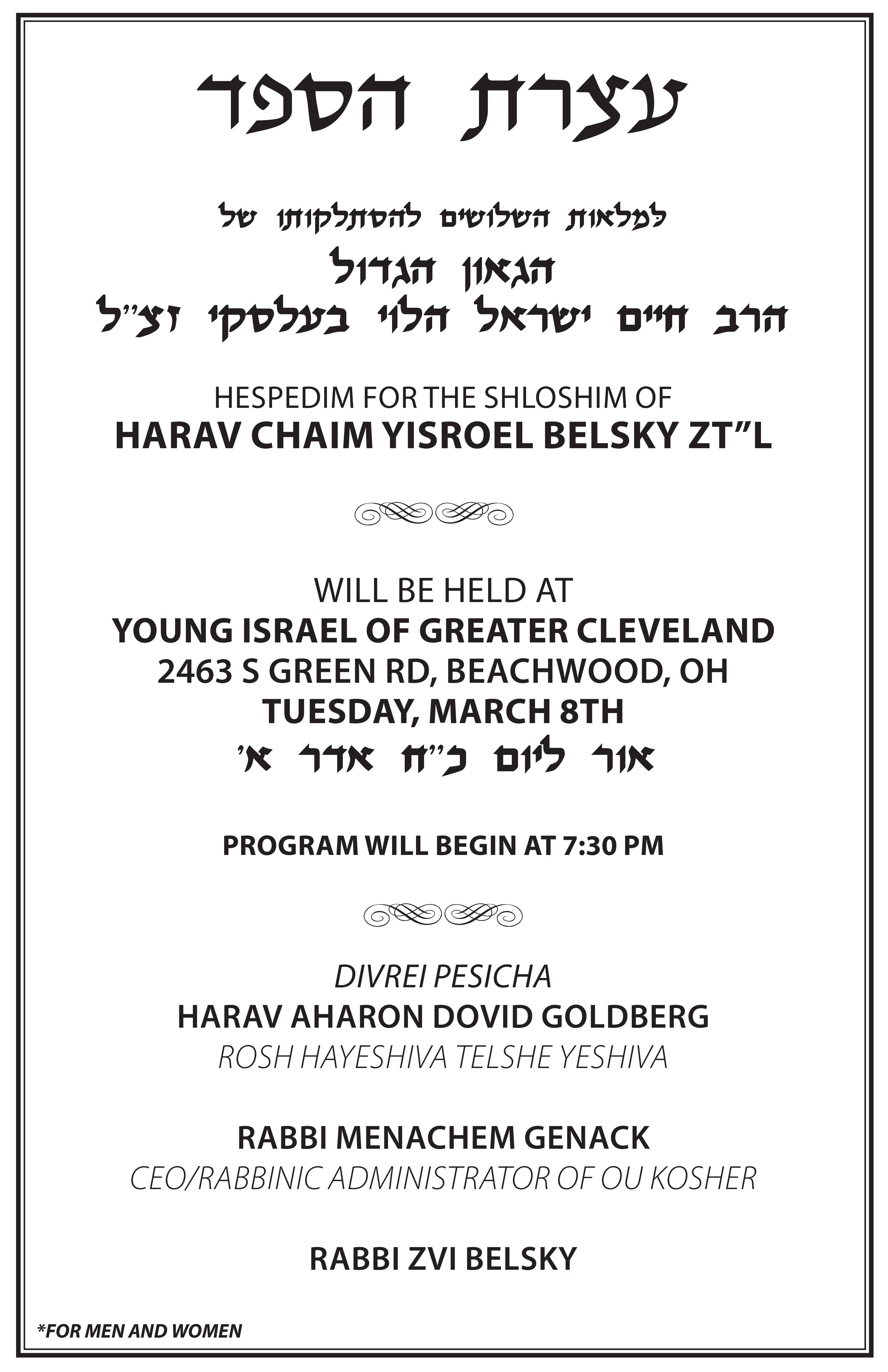 Sheloshim of HaRav Chaim Yisroel Belsky, zt”l