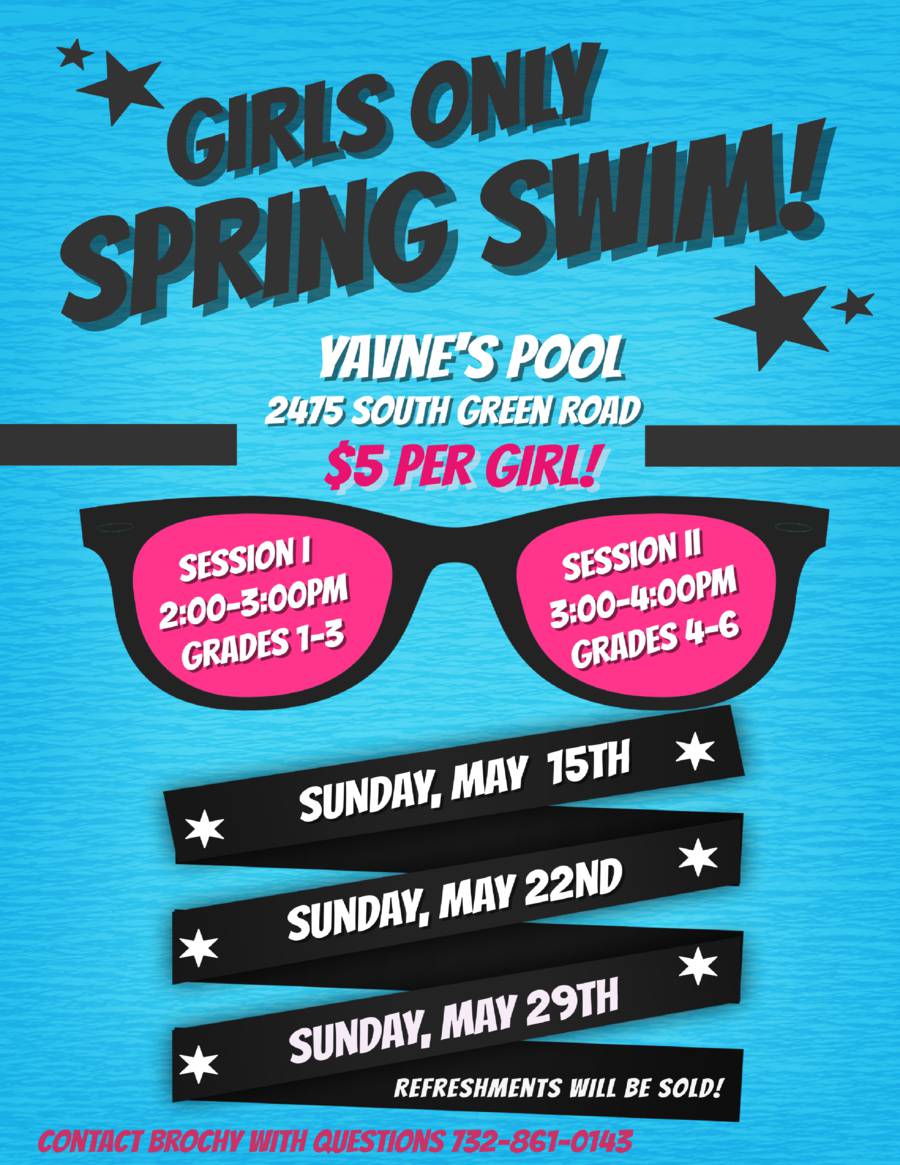 Rochie Berkowitz says May 15, 2016 at 8:02 am CHANGE IN DATES AND TIME There will be no spring swim on May 15th. We will have swimming on May 22 and 29. Session I will be 12:30-1:30 Session II will be 1:30-2:30 Updated flyer to follow. Reply