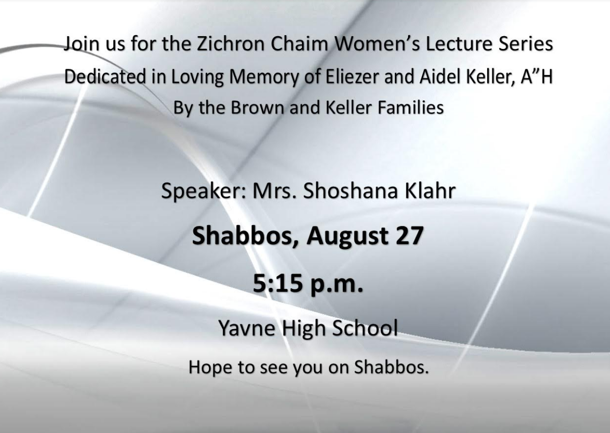 Zichron Chaim Women’s Lecture Series – Mrs. Shoshana Klahr (UPDATED SPEAKER)