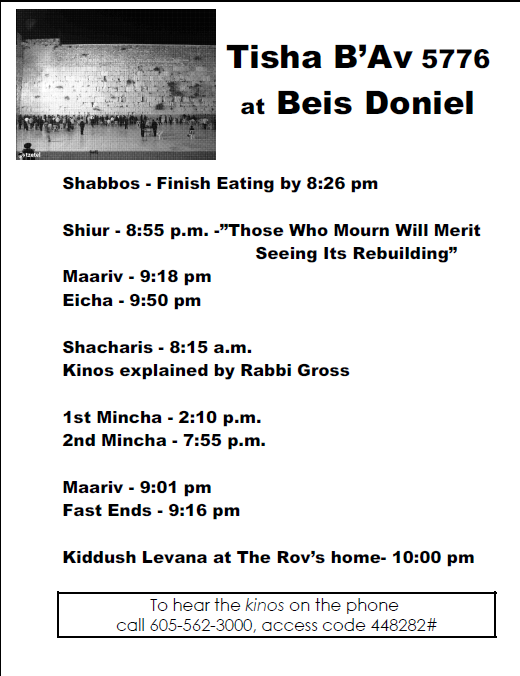 Rabbi Yehuda Cahan will speak this Shabbos for the women of the community on the topic “Growing on Tisha B’Av.” At 5.15, in the Yavne building.