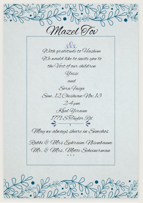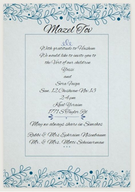With gratitude to Hashem we would like to invite you to the Vort of our children Yossi and Sora Faiga, Sunday, 12 Cheshvan, Nov. 13, 2-4pm at Khal Yeraim 1771 S. Taylor Road. May we always share in simchos!