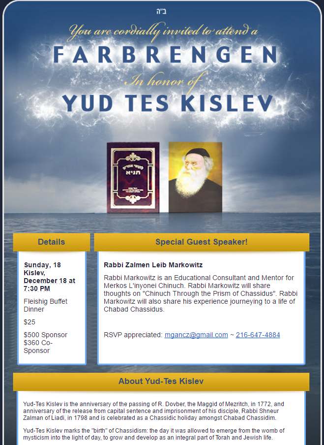 Chabad Invites You to the Annual Yud Tes Kislev Farbrengen and Dinner, 12/18 December 15, 2016 Leave a Comment