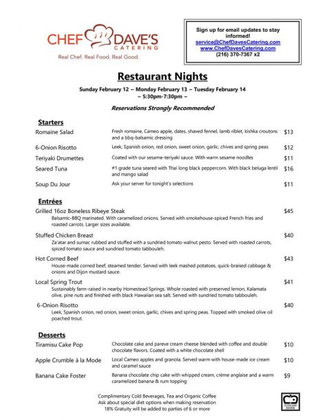 Our next set of Restaurant Nights will be Sunday 2/12, Monday 2/13 and Tuesday 2/14. Click image for menu.