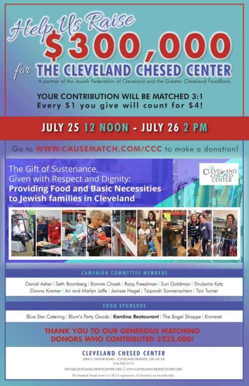 Join the 300 donors who have already given to the Cleveland Chesed Center and help us reach our goal of $300,000 by 2pm Wednesday! We have raised over $170,000 so far!