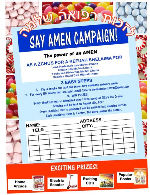 Amein Campaign for a Refuah Sheleimah for the Gruens! August 21, 2017 Leave a Comment Make a difference! Say “Amen!” Keep your eye on Local Jewish News for drawings, prizes, and winners! Click the image to download a printable form.