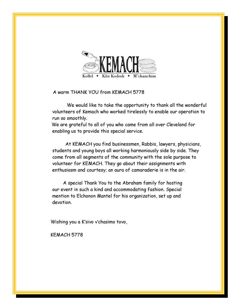 We would like to take the opportunity to thank all the wonderful volunteers of Kemach who worked tirelessly to enable our operation to run so smoothly.