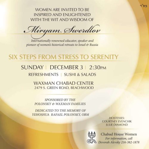 Special Event – “Six Steps from Stress to Serenity” with Miriam Swerdlov, Sunday, December 3rd December 2, 2017 Leave a Comment Dedicated by the Polonsky and Waxman families in the memory of Yehoshua Rafael Polonsky, ob”m.