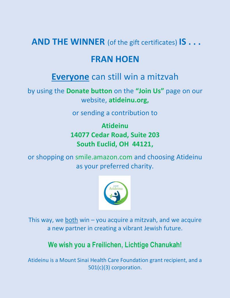Everyone can still be a winner by donating at www.atideinu.org, or choosing Atideinu as the preferred charity when shopping at smile.amazon.com. You acquire a mitzvah, and we acquire a partner in building a vibrant Jewish future.