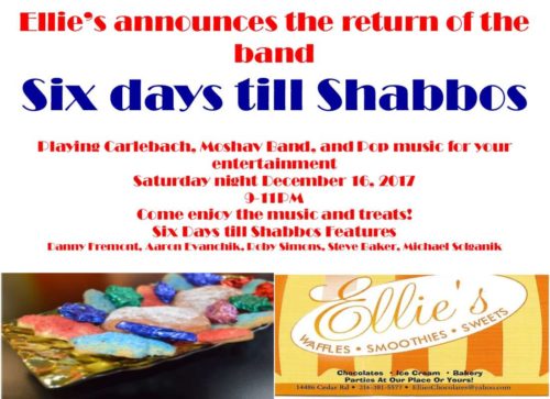 Ellie’s Announces the Return of the Band Six Days Till Shabbos! Saturday Night December 16th! December 10, 2017 Leave a Comment