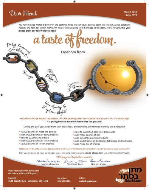 Your Donation to Matan B’sayser Will Give the Gift of Freedom March 12, 2018 Leave a Comment Donate online at www.matanbsayser.org.