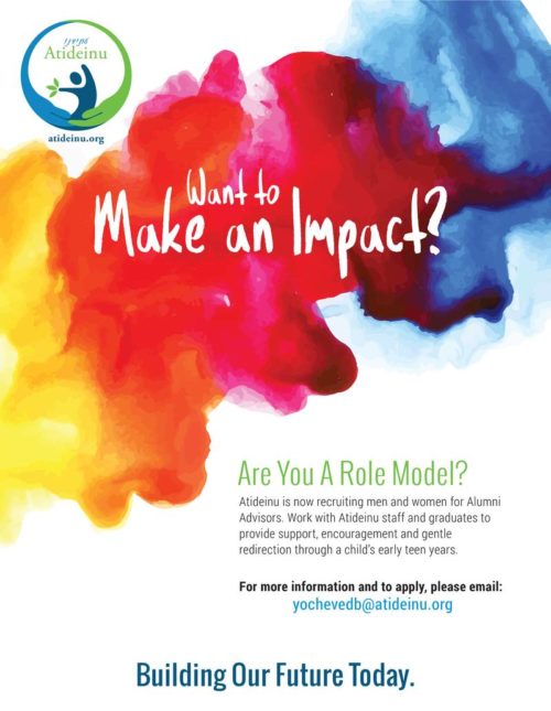 Are You a Role Model? Atideinu is Now Recruiting Men and Women as Alumni Advisors April 25, 2018 Leave a Comment For more information and to apply, please email yochevedb@atideinu.org.