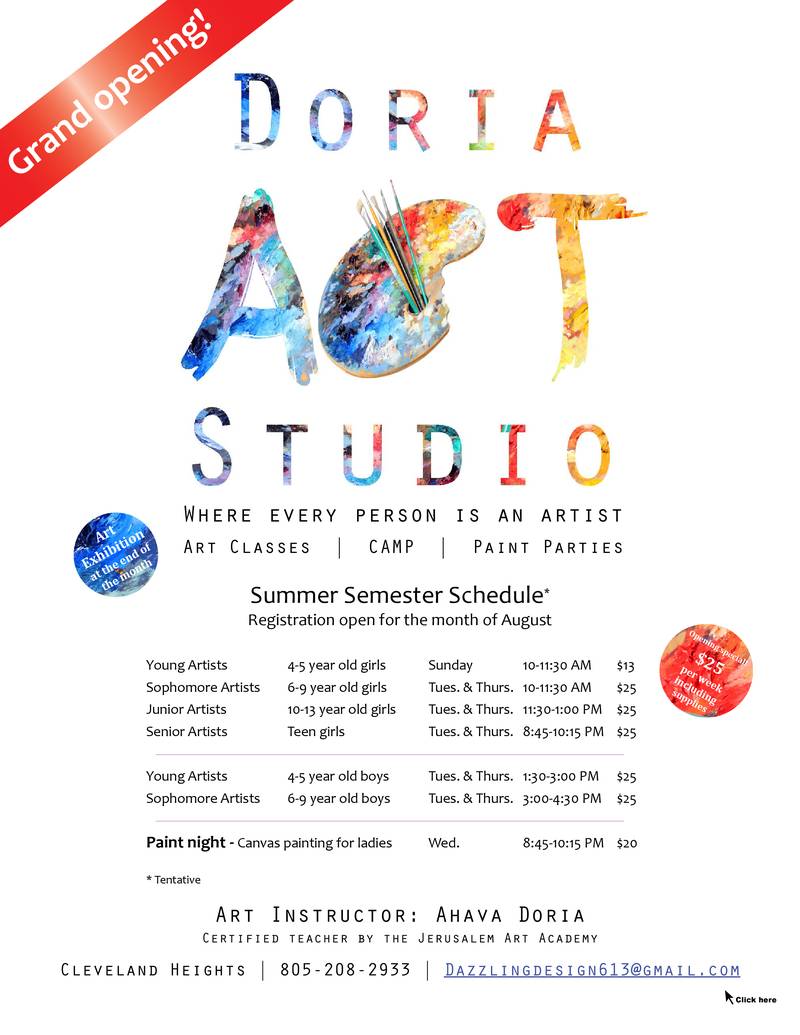 Doria Art Studio Grand Opening! July 25, 2018 Leave a Comment Registration for summer art courses underway. Special opening price $25 a week. Please call 805-208-2933.