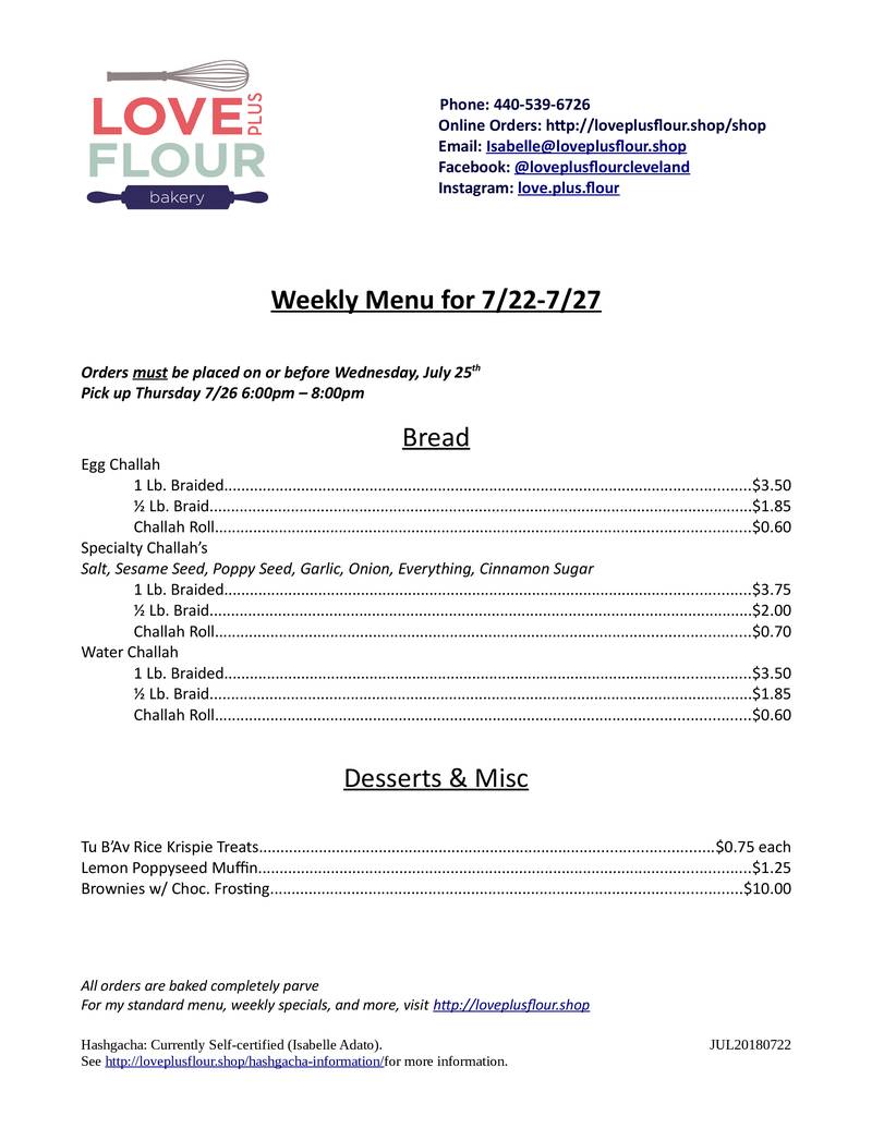 In honor of Tu B’Av I am offering some yummy Tu B’Av cereal treats – the marshmallow-y, crispy goodness you’ve loved since you were a child, in the shape of a heart and drizzled light pink and white frosting! I also have lemon poppy seed muffins and classic brownies with fudge frosting available this week. As always egg and water challah in multiple sizes and toppings are available as well.