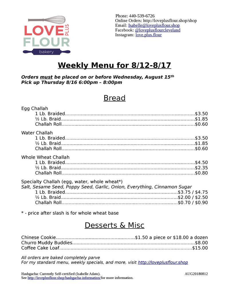 Keep an eye out tomorrow for my menus for chagim 2018, including early bird ordering which gives you 10% off your entire order! Meanwhile, the response to my whole wheat challah has been amazing, and I just want you to know that it will remain a permanent addition to my menu. This week includes some fan favorites including Chinese cookies, churro muddy buddies, and a lovely coffee cake loaf. As always whole wheat, egg and water challah in multiple sizes and toppings are available as well.