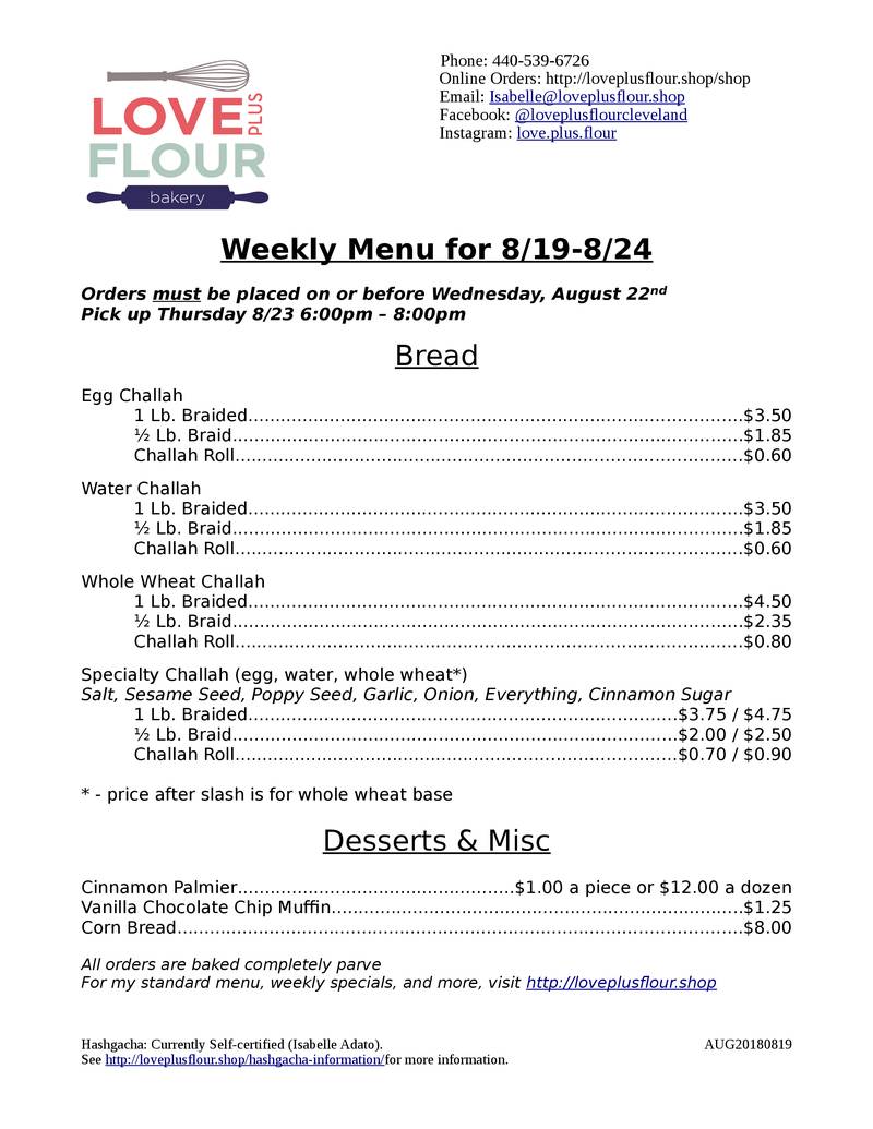 Love Plus Flour Weekly Menu for 8/19