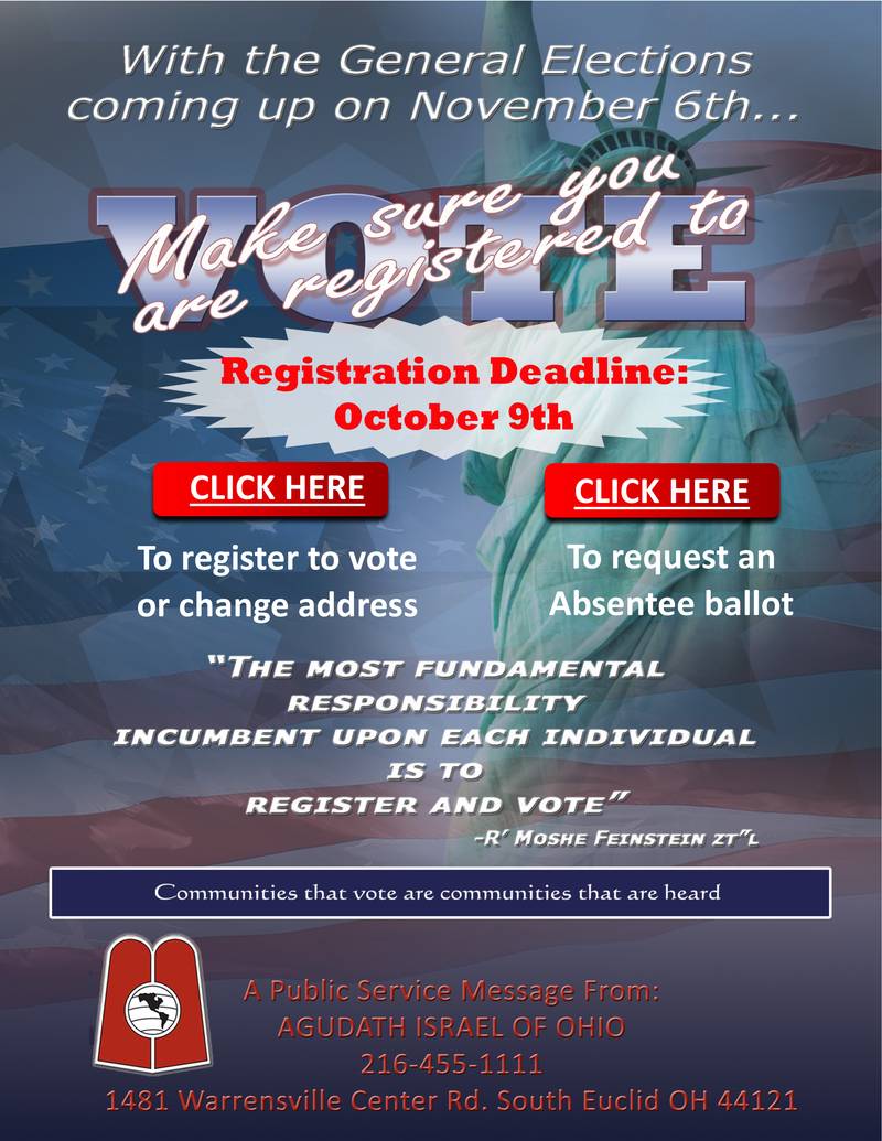 Elections Are November 6th – Reminder from Agudah to Register to Vote, Update Your Registration, or Request an Absentee Ballot