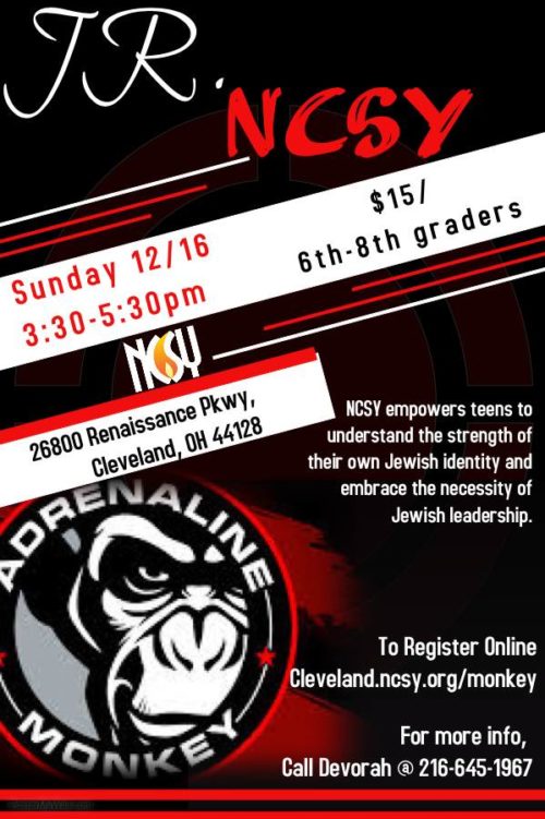 Join Jr. NCSY at Adrenaline Monkey this Sunday, 12/16! December 13, 2018 Leave a Comment To register please visit cleveland.ncsy.org/monkey/