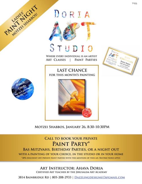 Paint Night at the Doria Art Studio this Motzei Shabbos, 8:30-10:30.