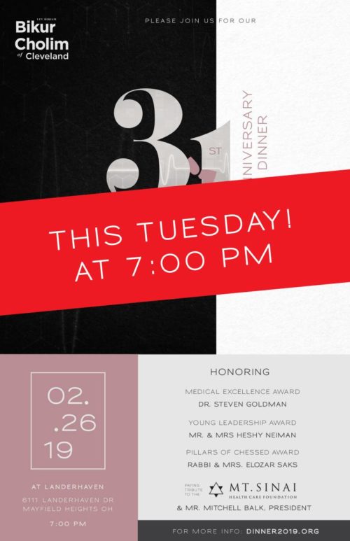 Join Bikur Cholim This Tuesday! Only a Few Seats Left at the 31st Anniversary Bikur Cholim Dinner!