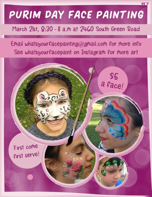 Purim Day Face Painting by What’s Your Face Painting, 8:30am-11am. Only $5 Per Face!