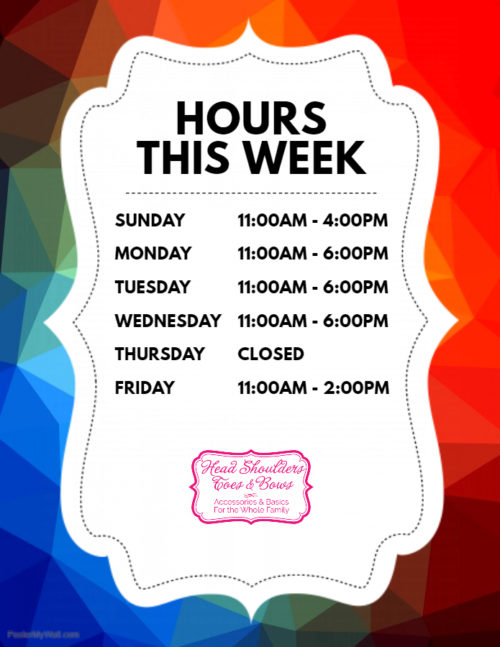 Head Shoulders Toes and Bows Hours This Week, 3/17-3/22