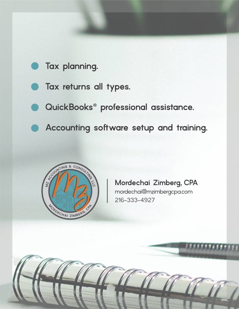 Tax Returns Prepared by MZ Accounting & Consulting LLC April 2, 2019 Leave a Comment There’s still time to get your tax return filed by the April 15th deadline Maximize your refund Personalized service Just call or text 216-333-4927 mordechai@mzimbergcpa.com