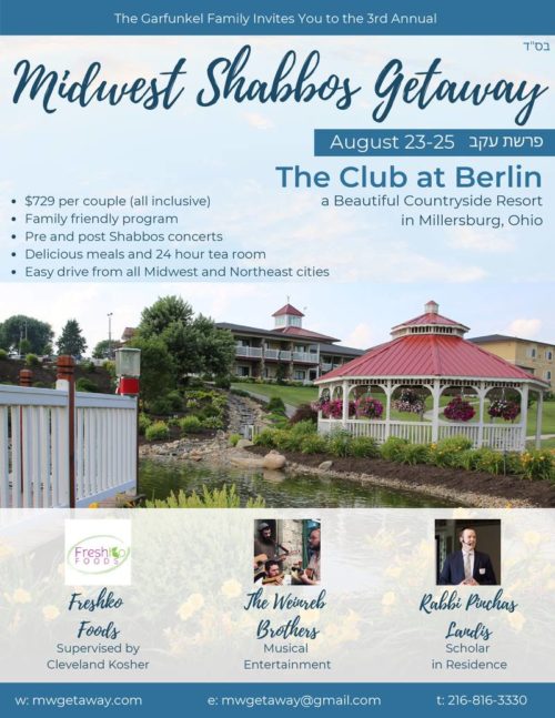 We invite you to join us for the Third Annual Midwest Shabbos Getaway. Join us August 23rd for the finest in Kosher weekend getaways. Enjoy the spacious and comfortable rooms, with first class accommodations, catering and entertainment.