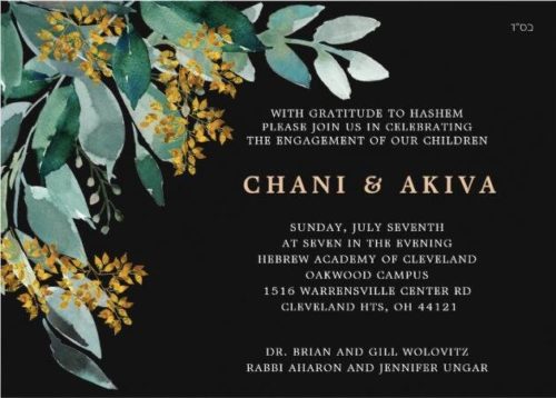 Mazel tov! Dr. and Mrs. Wolovitz and Rabbi and Mrs. Ungar invite the community to the vort of Chani and Akiva this Sunday, July 7th, 7 pm at Hebrew Academy of Cleveland-Oakwood Campus 1516 Warrensville Center Rd Cleveland Hts, OH 44121.
