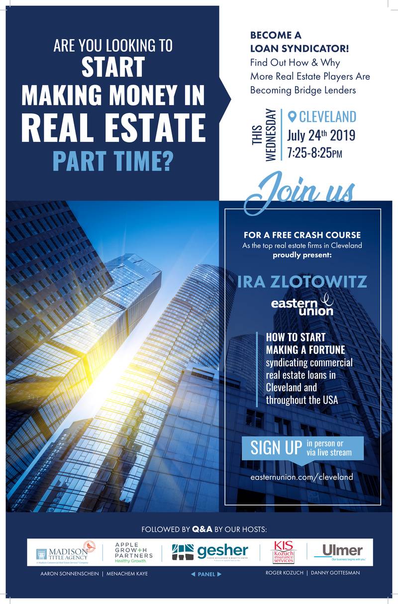 founder and president of Eastern Union. The one-hour event, which is geared toward anyone looking to learn more about commercial real estate or start their career in real estate part time, takes place this Wednesday night, July 24 at 7:25 p.m. at the Hyatt Place Legacy Village in Lyndhurst, Ohio. The event is sponsored by Madison Title Agency, Ulmer & Berne LLP, Kozuch Insurance